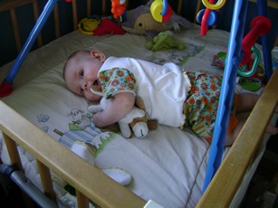 Over nieuwe dingen gesproken: Elisa besluit af en toe dat de wereld er leuker uitziet vanuit een buikpositie. Heel apart wanneer je je even omdraait en even later ligt ze ineens op haar buik te koekeloeren! Met haar 4 maanden en een week is ze er eerder mee dan Michaja. Ze vindt het trouwens ook helemaal prachtig wanneer je haar op je schoot laat ‘staan’, of nog beter: springen! Dan heeft ze dikke pret! Het is ook zo’n lekker mensje…