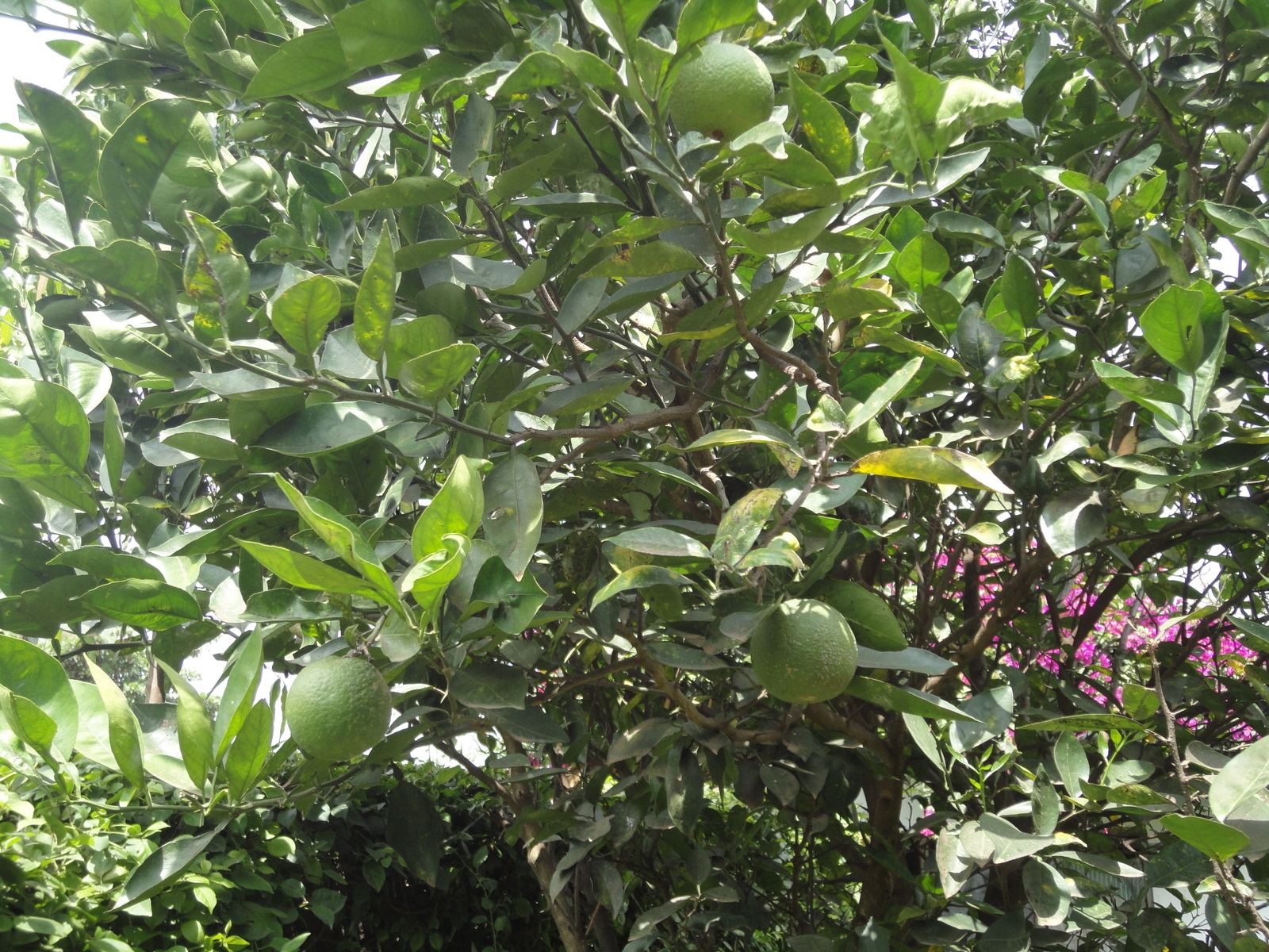 We hebben in onze tuin twee sinaasappelbomen staan. De kleine – geënt op een citroenstammetje – heeft nog steeds geen vruchten gedragen, maar de grote wel. Vorig jaar hadden we vijf sinaasappels, dit jaar zo’n 15, en volgend jaar hopelijk nog meer. We plukken ze als ze groen zijn (oranje sinaasappels hebben we hier nog niet aan de boom zien hangen).