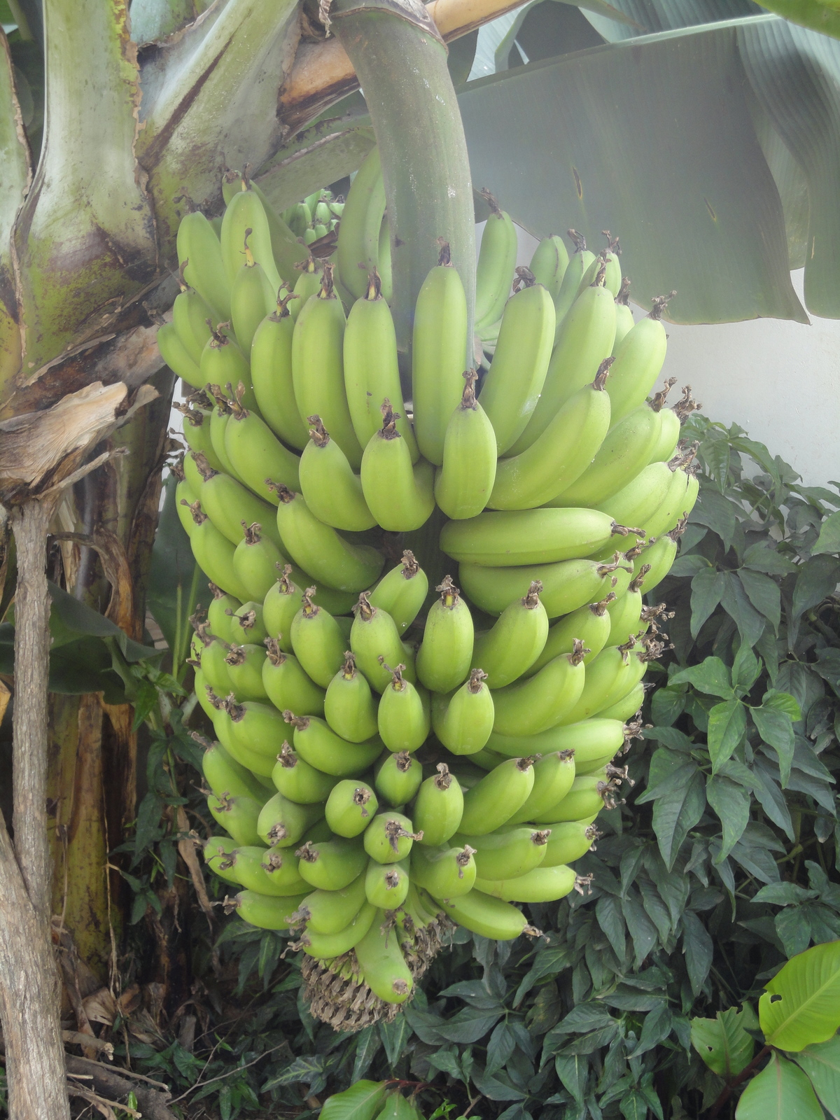 Naast ons huis hebben we een paar bananenplanten staan (want bomen kun je het niet noemen). Iedere 3-4 maanden oogsten we een grote tros zoals deze. De tros hangt naar beneden en de bananen krom naar boven (ik dacht altijd dat ze ze krom naar beneden groeiden, voordat ik het met eigen ogen gezien had). De bananen zijn echt heerlijk en zoet, veel lekkerder dan de bananen die al heel vroeg in Zuid-Amerika geplukt worden en onderweg naar Europa pas rijp worden. Wie ooit volrijpe bananen heeft geproefd, vindt die in Nederland naar karton smaken.