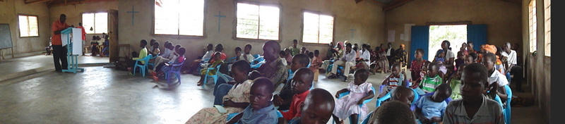 Foto 3: Een panorama-foto van de gemeente die luistert naar vertaler John Masige. Hij leest een hoofdstuk uit de Bijbel voor in de Kabwa-taal.