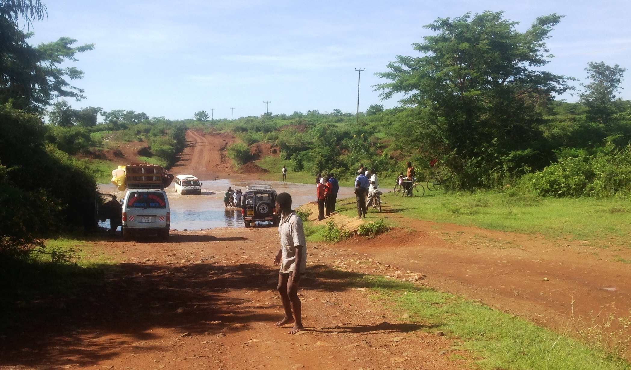 Wat jongelui uit een naburig dorp, die van het probleem een bron van inkomsten heeft gemaakt, staan klaar om ons door de rivier te duwen. De motor uit natuurlijk, want we zullen tot halverwege de autodeuren onder water komen. We wikken en wegen wat te doen. Het is nog vroeg in de morgen. De rivier is nu nog zo’n 30 meter breed, maar hoe zal het vanavond zijn als we op de terugweg er weer door moeten? Het regent momenteel iedere dag, en de rivier zal ongetwijfeld snel dieper worden. We besluiten dat het wel een beetje een groot risico is met een auto die ons zojuist al in de steek heeft gelaten. We gaan terug. Met pijn in het hart, want we weten dat zo’n 25 kilometer aan de andere kant van de rivier een groepje mannen op ons wacht. Het zou de eerste keer zijn dat ze de Bijbel in de Kabwa-taal zouden gaan horen. Ze hadden ons de hele morgen regelmatig gebeld of we er al aankwamen. We zijn zwaar teleurgesteld dat we ze nu moeten laten wachten. Wellicht dat we na het regenseizoen, of met een betere auto, de overtocht kunnen wagen, en ook deze mannen God in hun eigen taal horen spreken.