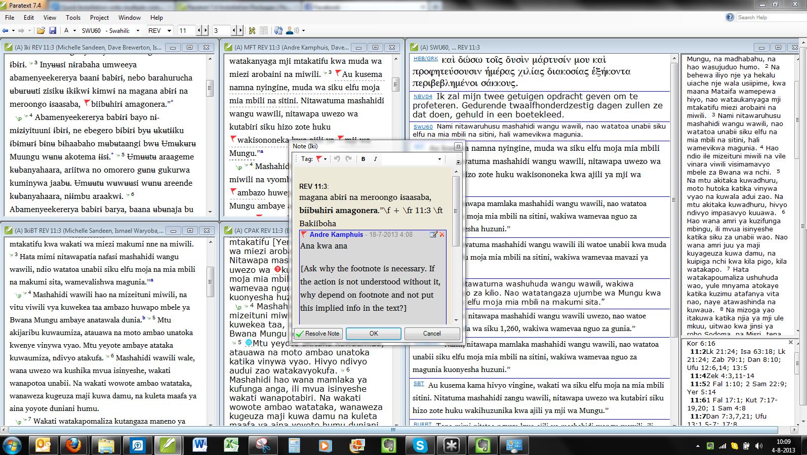 We besloten om toch verder te gaan met de vertaalcontrole. We projecteerden op de muur het scherm van de vertalers, zodat ik mee kon kijken naar hun vertaling en de vragen kon zien die ik in de tekst had achtergelaten. Telkens moest ik proberen om me de discussie en suggesties te herinneren die ik eerder deze week had genoteerd. Een hele uitdaging als je flinke hoofdpijn hebt. Het was even een ontmoedigend moment, maar we voelden duidelijk dat hier wellicht duistere machten aan het werk waren om te verhinderen dat we dit boek van de Bijbel beschikbaar zouden maken. En om eerlijk te zijn, dat geeft nou precies extra energie om ons niet uit het veld te laten slaan! Een van de vertalers zei: “Blijkbaar doen we iets waar de duivel niet blij mee is. Laten we proberen om door te gaan, want Jezus is bij ons!” Dat hebben we gedaan.